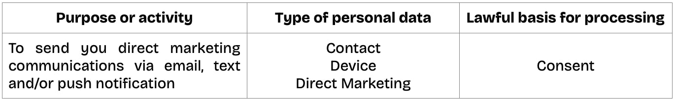 During the registration process, when your personal data is collected, you will be asked to indicate your preferences for receiving direct marketing communications from us via email, SMS, the App or push notifications. You may also receive marketing communications from us if you have requested information from us or used our programme / services, and you have not opted out of receiving the marketing.
