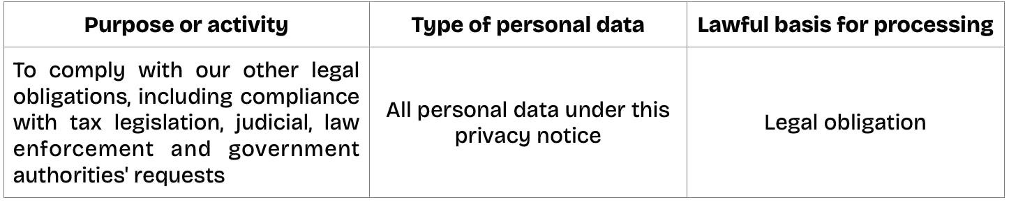 We will only use your personal data when we have a lawful basis to do so. Our lawful basis for each purpose for which we use your personal data is specified below. Most commonly we will use your personal data in the following circumstances: