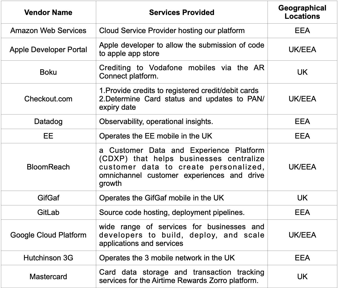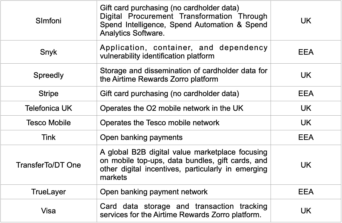 Airtime will also share the data with Mobile Network Operators for marketing purposes. This data is limited to the customer's phone number, whether a card or open banking provider account (as applicable) has been added to the account, whether a transaction has been made, the date of the last transaction, whether a redemption has been made and when, if applicable. You may opt out of this sharing arrangement at any time by contacting us at support@airtime.co.uk.